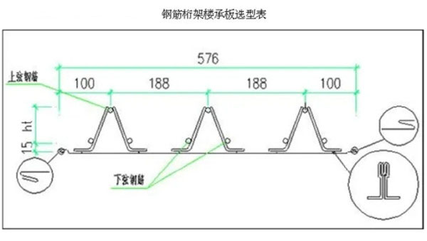 鋼筋桁架樓承板的規(guī)格包括很多方面,除了鋼筋桁架,還有樓板厚度、底模鋼板寬度等。鋼筋桁架高度規(guī)格一般為70-270mm,底模寬度常用576/600mm,樓板厚度一般為100-300mm,還有上下弦、腹桿直徑等規(guī)格,這些規(guī)格主要根據(jù)設計圖紙要求來確定。